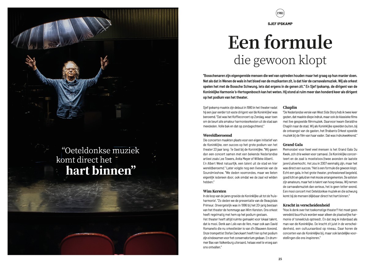 29-10-2025 | Hij stond bijna veertig jaar op het podium als dirigent van Koninklijke Harmonie ’s-Hertogenbosch. Bij zijn afscheid als dirigent van het orkest in februari 2022 kreeg Sjef Ipskamp een cadeau van Theater aan de Parade; één dag de Casinozaal voor een programma naar keuze. In juni was hij dan ook nog te gast bij zijn eigen Sjef's Special. Sjef Ipskamp overleed gisteravond, op 28 oktober.