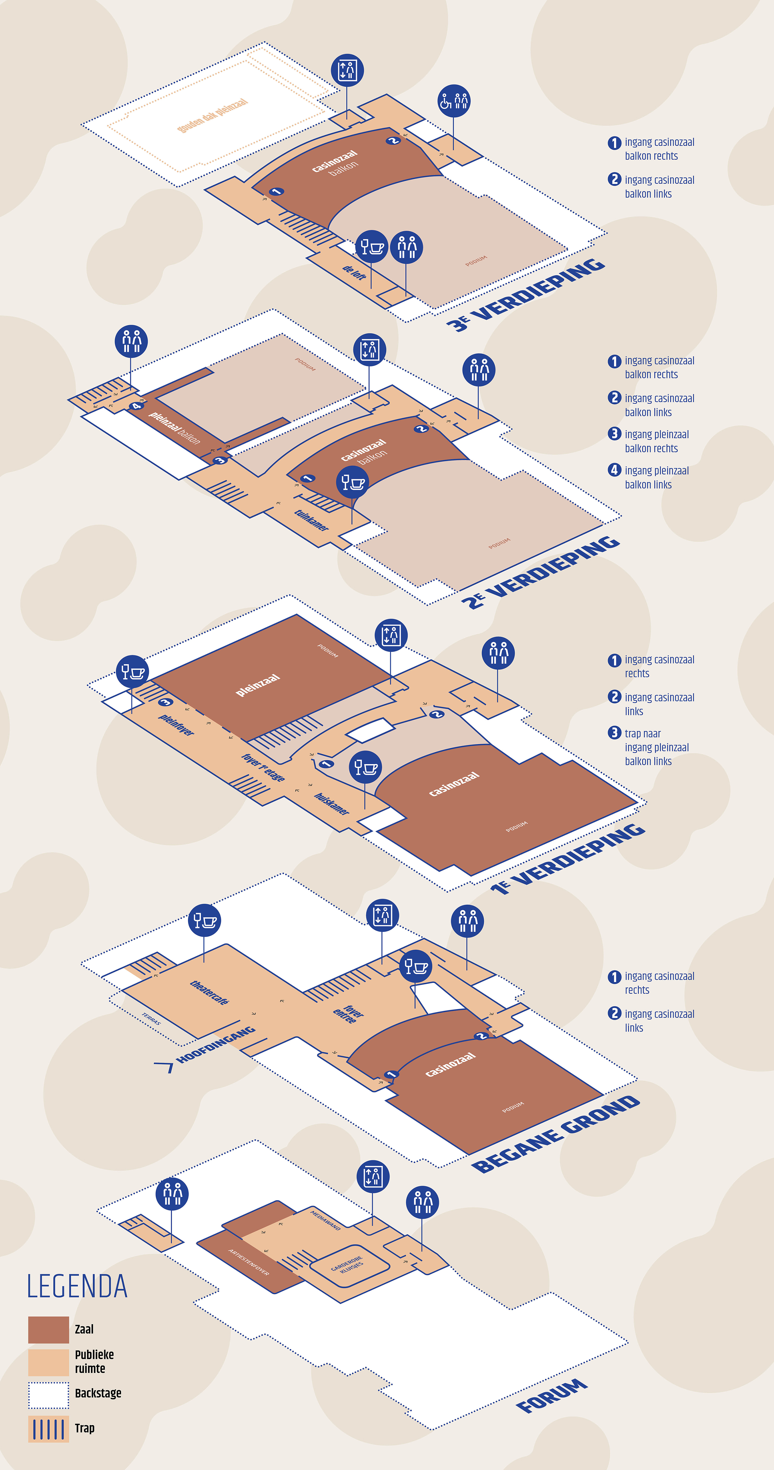 Bekijk de plattegrond van het theater, opgedeeld in vijf verdiepingen.