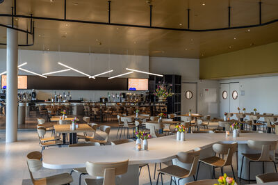 Het karakteristieke gouden plafond en de speciaal ontworpen tafels zorgen voor een stijlvolle setting die ontmoeting en interactie stimuleert. In de zomer kan de glazen pui volledig worden geopend, waardoor het café naadloos overgaat in een terras. Met gordijnen kan de ruimte eenvoudig worden afgesloten voor extra privacy tijdens besloten evenementen.